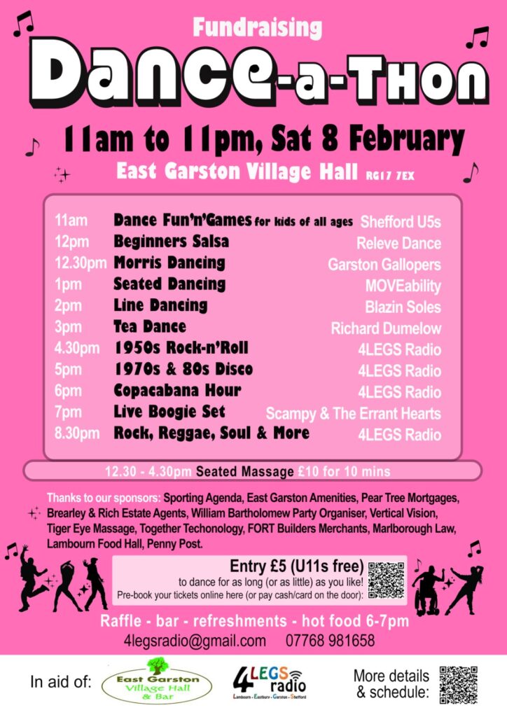 We don’t expect any single person to dance for 12 hours, just come on over and join in the fun to support two great causes in the Lambourn Valley – 4LEGS Radio and East Garston Village Hall.